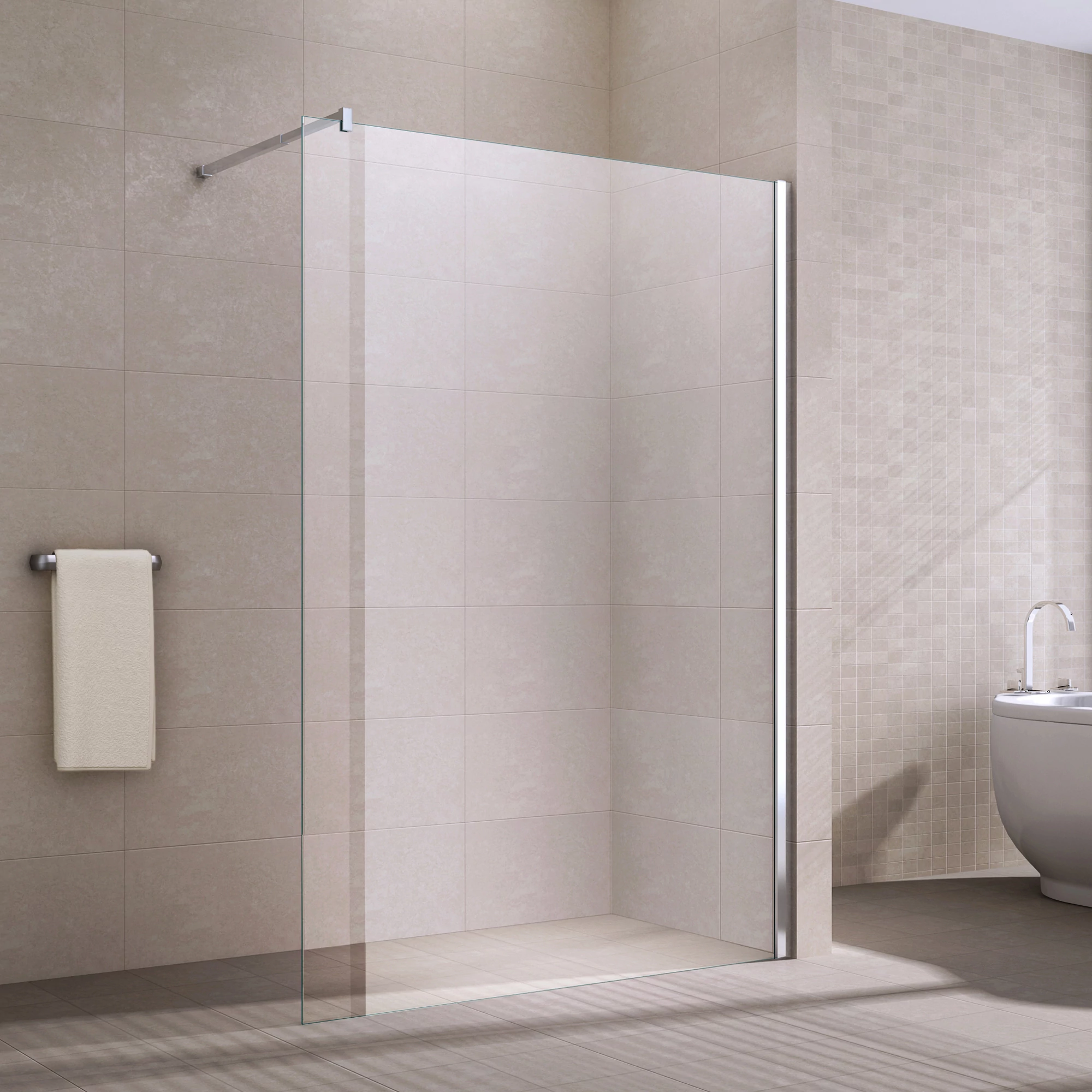 Zuhanyfalaink letisztult és elegáns megjelenést biztosítanak az Ön fürdőszobájában is. Azon túl, hogy termékeink széles szín és méretválasztékban elérhetőek, telepítésük roppant egyszerű. A 8 mm vastag biztonsági üvegek és a rozsdamentes acél anyagú távtartók biztosítják a zuhanyfal hosszú élettartamát és a kényelmes, biztonságos használatát. Az üveglap felülete NANO bevonatos kezelést is kapott, mely során ellenállóbb lett a vízkő, szappan és egyéb lerakódásokkal szemben, így a tisztántartása rendkívül egyszerű. A rozsdamentes acél távtartó rúd tetszőlegesen méretre vágható, így nem kötött a beszerelési mélység. Az távtartó rúd méretezhetősége 68-120 cm. A szerelvényeknek köszönhetően szerelési irányuk univerzális, így tetszőlegesen jobbos, vagy balos irányban is felszerelhetőek. Az eseteges fali egyenlőtlenségeket kiválóan el tudják tüntetni, mivel a fali profil állítható 1,5 cm-t.